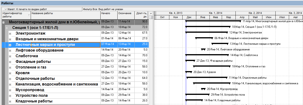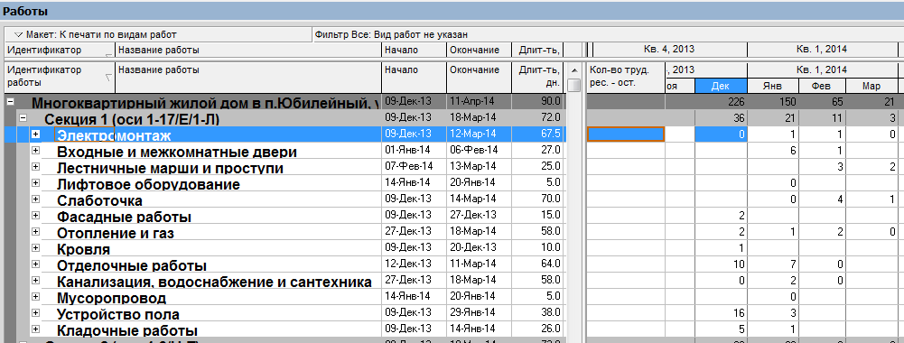 - детальное расписание, в котором работы представлены по этажам и секциям